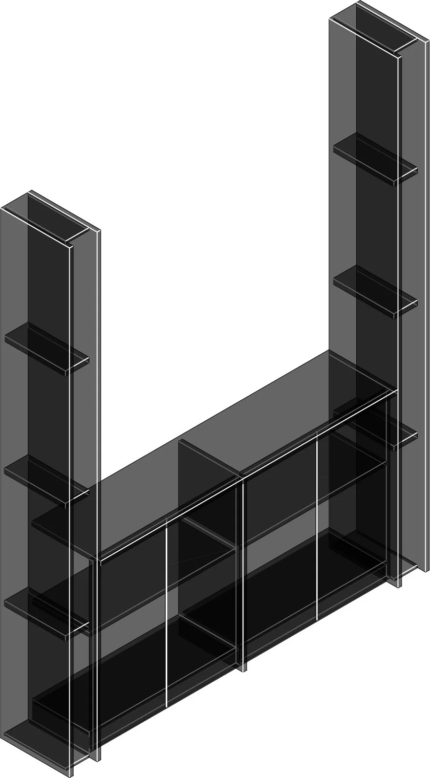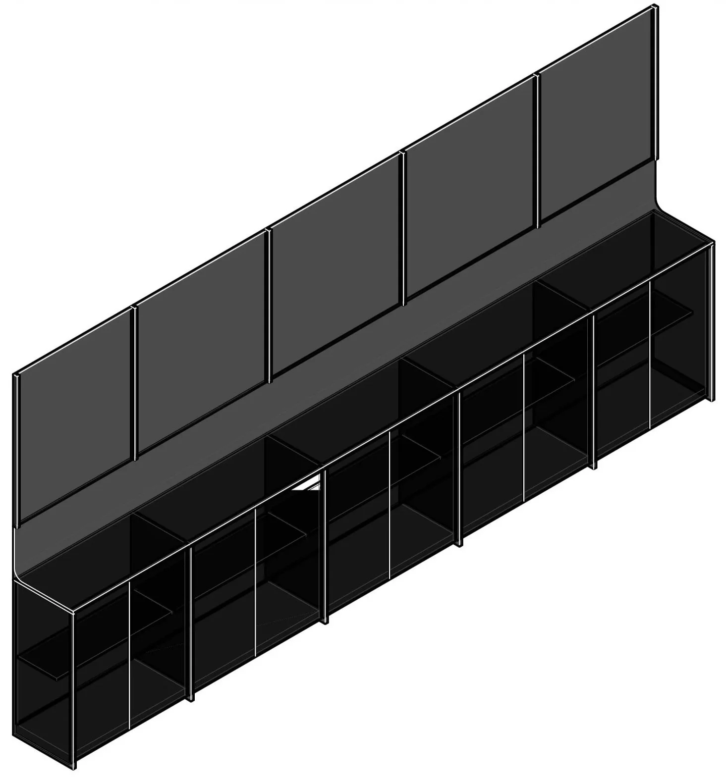 Custom storage shelving is integrated along the periphery, designed to remain visually light while offering ample storage. These built-in elements reduce clutter and reinforce clean sightlines, allowing the office to function efficiently without reliance on loose furniture.