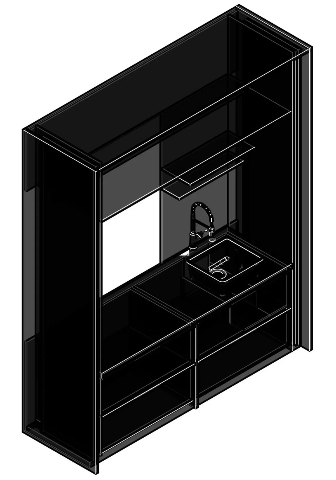 The pantry is designed as a compact, concealed insert within the office plan. When closed, it reads as a seamless part of the wall, preserving the calmness of the workspace. When in use, natural stone countertops, vertical textured panels, and warm task lighting reveal a functional yet refined utility zone, thoughtfully integrated into the overall design language.